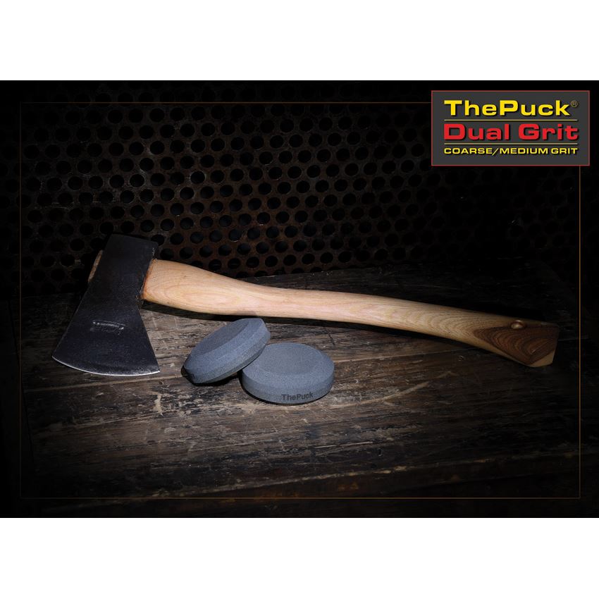 Model - LSPK. Puck Sharpener. 3 inch diameter dual grit carbide sharpening stone measures 1 inch thick. Ideal for lawn mower blades, machetes, garden tools, etc.