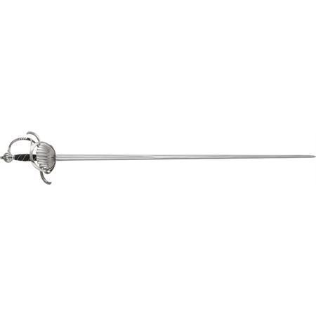 Model - CS88CHR. Cold Steel 88CHR - Ribbed Shell Cup Hilt Rapier Sword with Black wood and Rayskin Handle. Construction: 1060 Carbon Steel; Overall: 50.5"; Blade: 41.5" l Carbon Steel l Satin Finish; Handle: Black; Other Info: Black wood and rayskin handle with silver wire wrap and heavy stainless ribbed pommel. Stainless hilt. Black leather scabbard with steel fittings. Boxed. Made in China.
