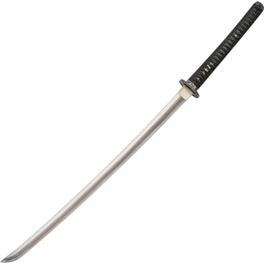 Model/Item/Part - PC6018KLG. Paul Chen Swords - Oni Katana with Black Rayskin Handle. 44.5" overall. 28.88" carbon steel blade. Black cord wrapped handle. Antiqued black iron tsuba and fittings. Comes with cleaning kit and storage sleeve. Black wood scabbard. Made in China.