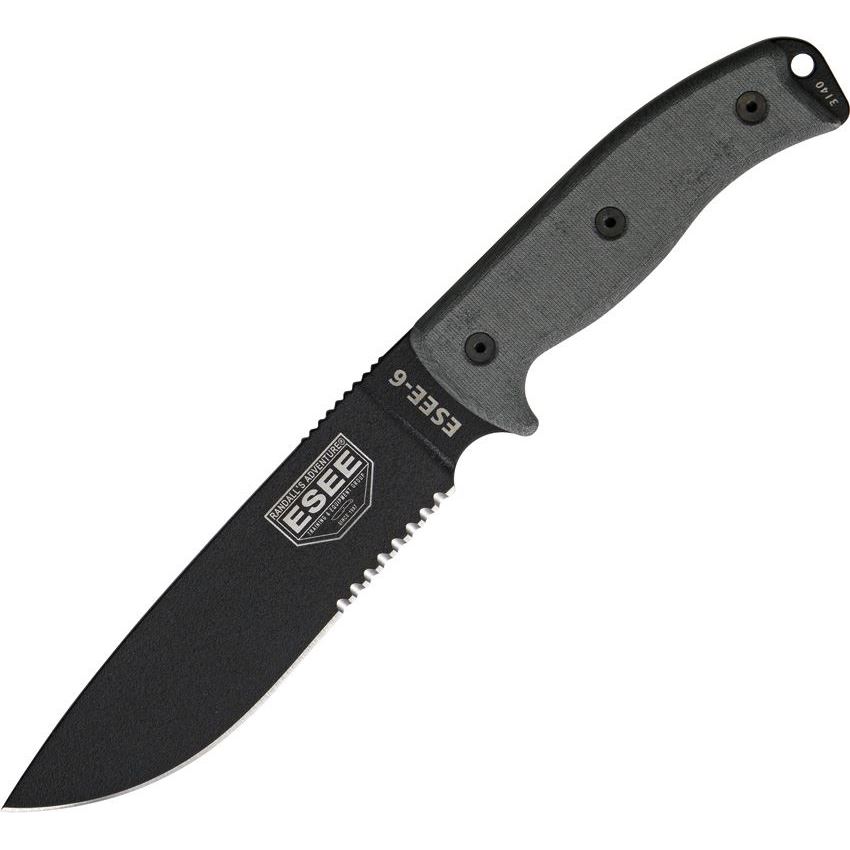 Model - ES6SKOBK. ESEE 6SKOBK - Model 6 Part Serrated Fixed Blade Knife with Black Linen Micarta Handels. 11.75" overall. 5.75" black powder coated partially serrated 1095HC steel blade. Black linen micarta handle. Lanyard hole. Full, extended tang. Knife only. Proudly made in the USA.
