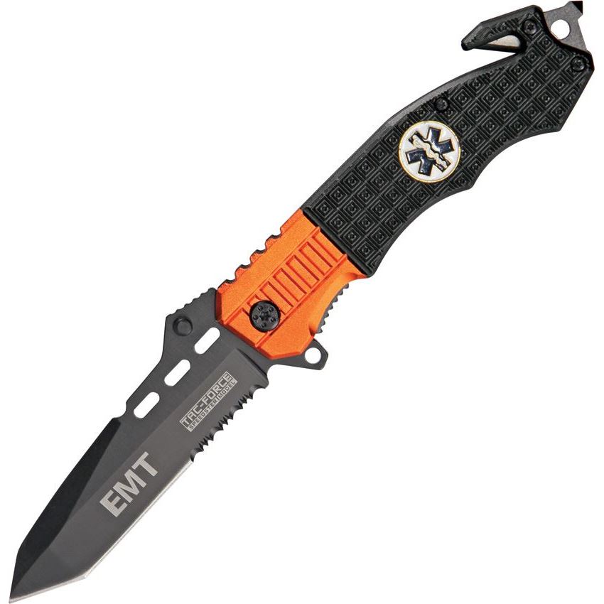Model/Item/Part - TF740EM. Tac Force Knives - EMT Part Serrated Linerlock Folding Pocket Knife. Assisted opening. 5" (12.7cm) closed. 3.5" (8.89cm) black finish partially serrated stainless blade. Black and orange aluminum handle. Thumb stud. Extended tang. Inlay shield. Belt/cord cutter. Glass breaker. Lanyard hole. Pocket clip. Boxed. Made in China.