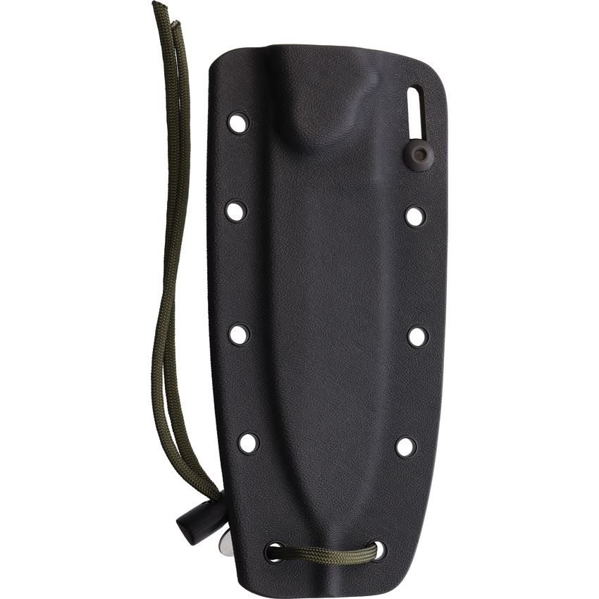 Model - ESLSPDT. Laser Strike. 10 inch overall. 4.88 inch desert tan powder coated 1095HC steel blade. Desert tan canvas micarta handle. Full tang. Lanyard hole. Handles feature a divot that can be used as the socket for the fire bow drill method. Stored inside handle is a ferro rod and tinder tabs. Black molded plastic clip sheath. Bulk packed.