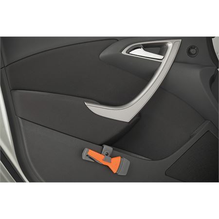 Model - LHR00603. Safety Hammer Evolution. 6.25 inch overall. Automatic safety hammer is easy and safe to use by adults and children. Simply press the head of the safety hammer against the car's side window and the ultra-hard, spring-loaded ceramic hammer head will come out, shatter the window and reload automatically. Directly after shattering the first window this action can be repeated several times. Non-slip orange and gray polypropylene handle with integrated seat belt cutter. Comes with Quick Click mounting system which allows the hammer to be clipped onto the door with no drilling. The click adapters can be turned 360° to ensure convenient positioning. An additional LifeHammer product can be mounted on the other side of the Quick Click System if desired. Boxed with hanging tab. Made in Netherlands.