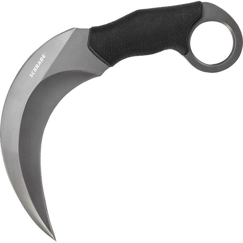 Model/Item/Part - SCH112. Schrade Knives - ShaSTA Mc'Nasty Fixed Dual Edged Blade Knife with Thermoplastic Black Handle. Overall: 8.5"; Blade: 6" l 8Cr13MoV High Carbon Stainless l Standard Edge l Coated Finish; Handle: Black l Thermoplastic; Other Info: Full Tang. Dual edged blade. Finger ring pommel. Black thermoplastic sheath. Boxed. Made in China.