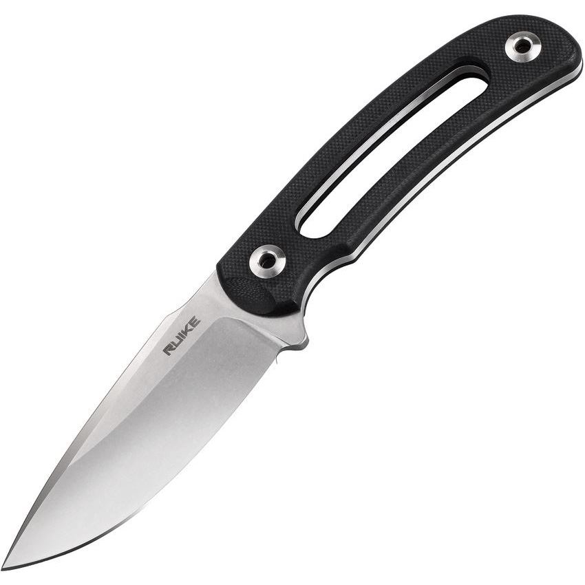 Model/Item/Part - RKEF815B. Ruike Knives - Hornet F815 Black Fixed Blade Knife. Overall: 7.5"; Blade: 3.25" l 14C28N Stainless l Standard Edge l Stonewash Finish; Handle: Black l G10; Other Info: Hollowed handle. Black molded ABS sheath with belt clip attachment. Boxed. Made in China.