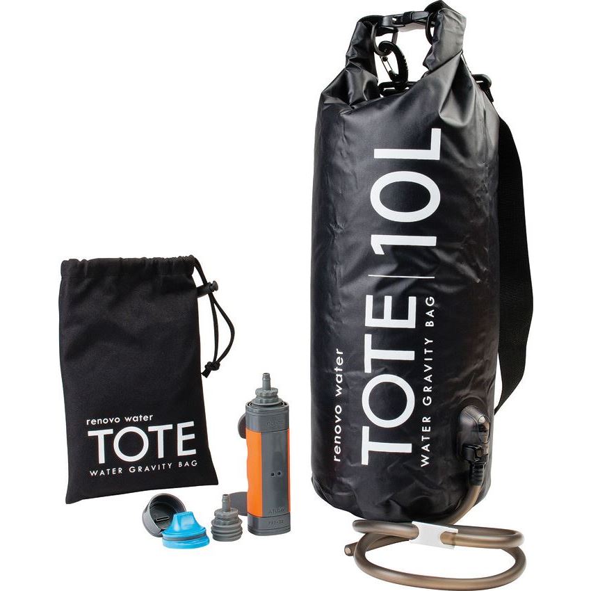 Model - RENM25. Renovo Water 25 - MUV Hydration Libation Tote Gravity Water Bag. Includes: MUV2 Holly Fiber filter, 10L gravity bag, straw mouthpiece, hose and accessories. Filters 99.999% of bacteria (Giardia, eColi, Cryptosporidium). Blocks sediment and large particulate. MUV2 filter can be back flushed for long life. 100,000 gallon filter capacity. Boxed with hanging tab. Made in China.
