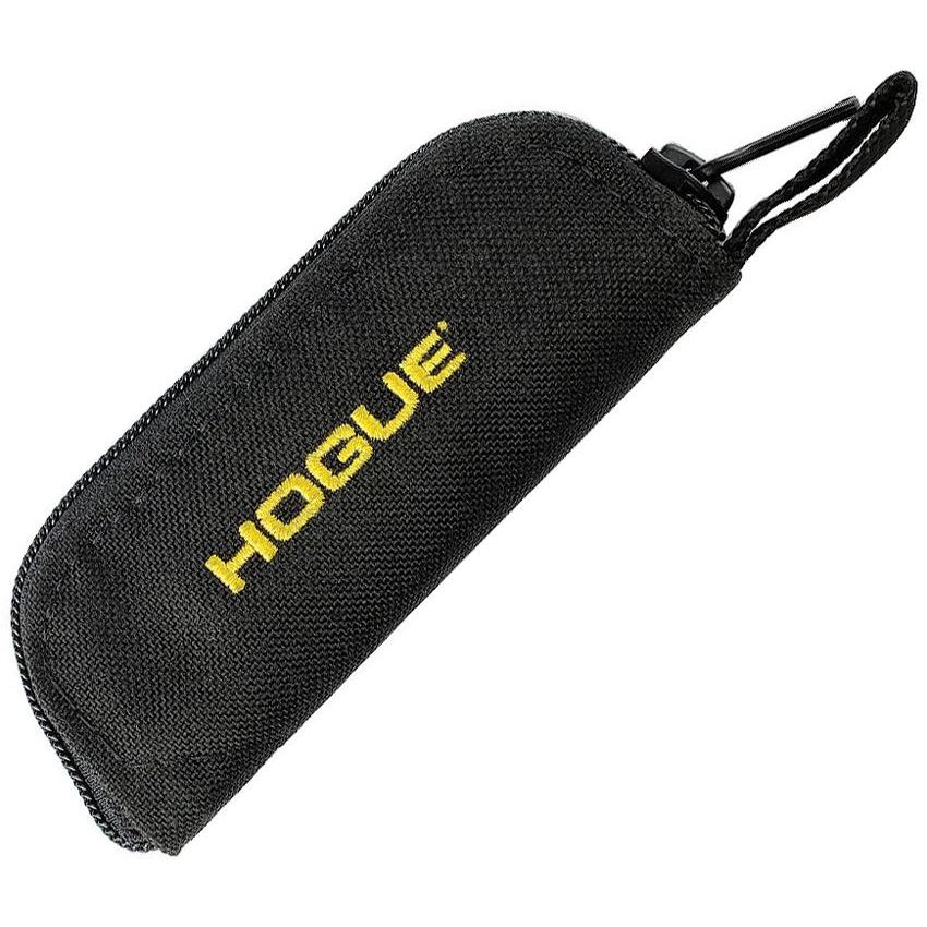 Model - HO35095. Small Zipper Pouch. Fits folding knives 1.25 inch x 4.25 inch. Hogue logo embroidered on front. Black nylon zippered storage case. Bulk packed.