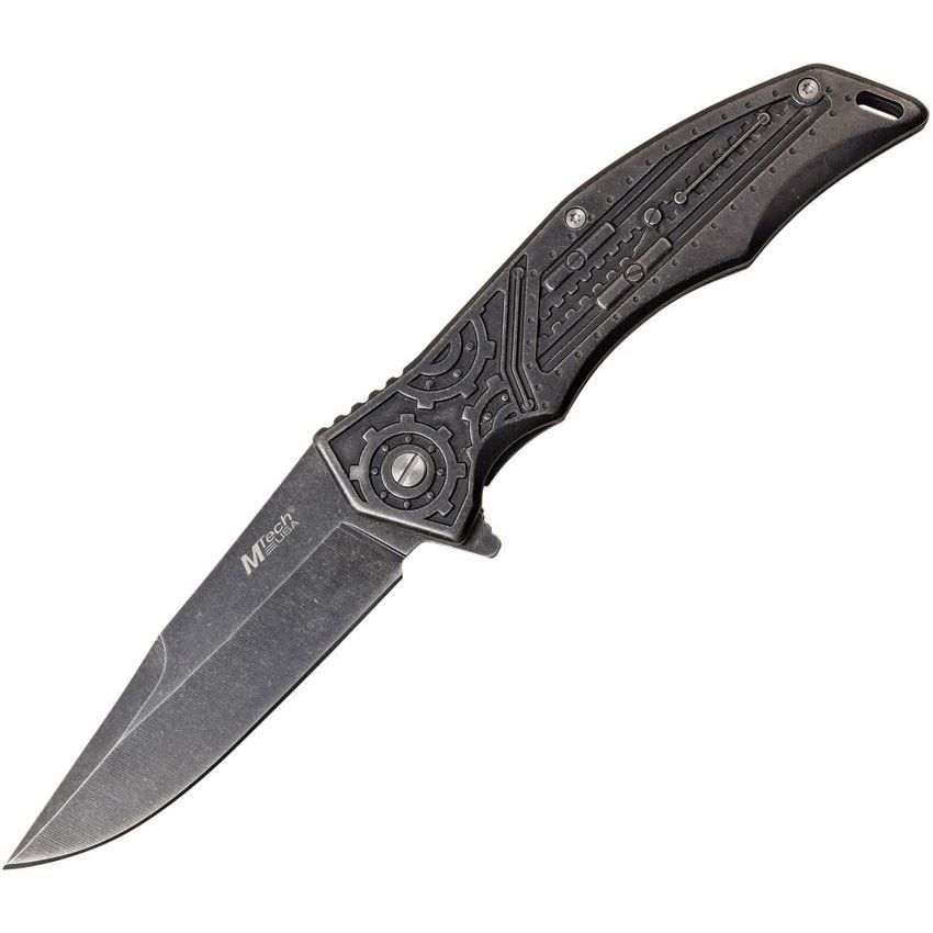Model/Item/Part - MTA1095SW. MTech Knives - Gear Framelock Assisted Opening Knife with Stainless Handle. Assisted opening. 5" closed. 3.75" black stonewash finish 3Cr13 stainless blade. Black stonewash finish stainless handle. Extended tang. Lanyard hole. Pocket clip. Boxed. Made in China.