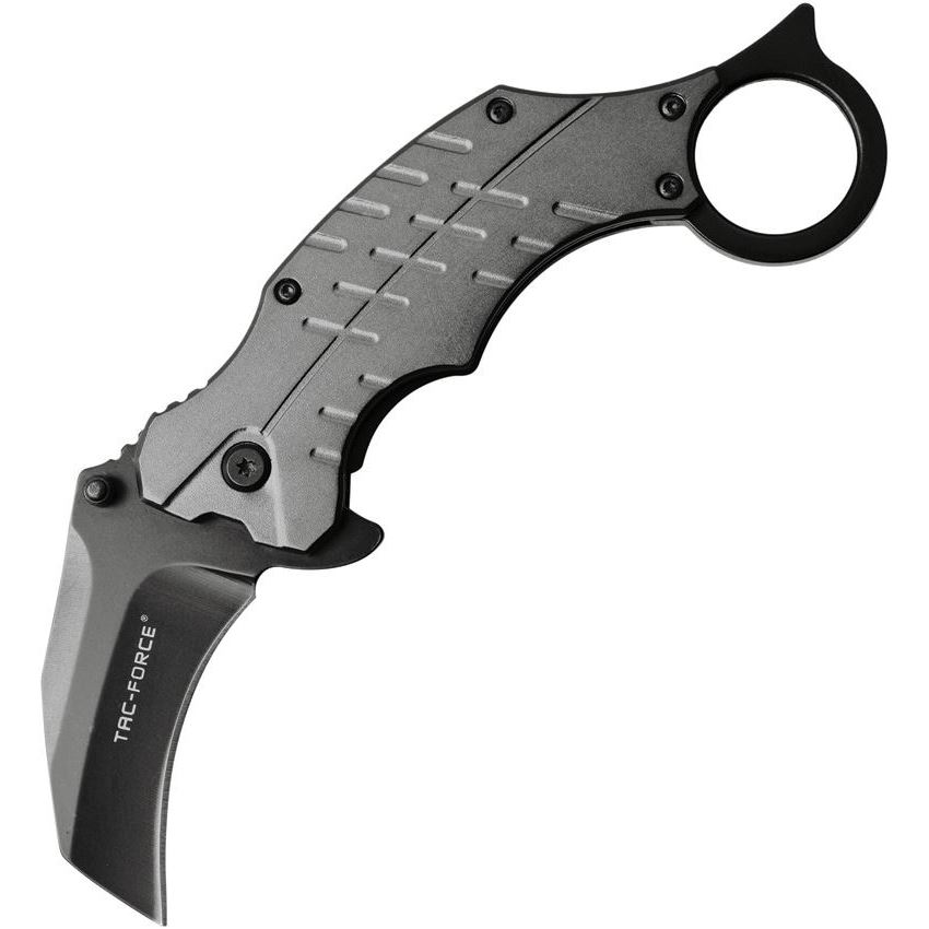Model/Item/Part - TF1020GY. Tac Force Knives - Linerlock Knife Assist Open Gray. Assisted opening. 5" closed. 2.5" black finish 3Cr13 stainless karambit blade. Gray aluminum handle. Extended tang. Thumb stud. Finger ring. Pocket clip. Boxed. Made in China.