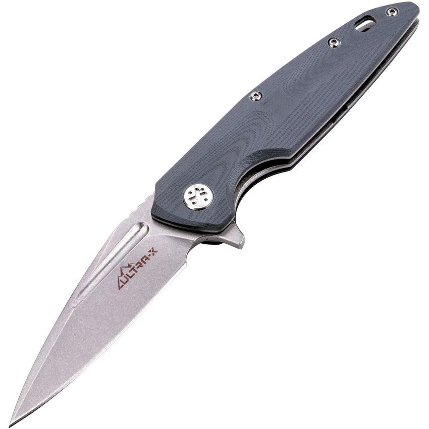 Model/Item/Part - UXHK211J. Ultra-X - BAT 440C Grey. 4.75" closed. 3.5" stonewash finish 440C stainless blade. Blue-Gray G10 handle. Extended tang. Lanyard hole. Pocket clip. Boxed. Made in China.