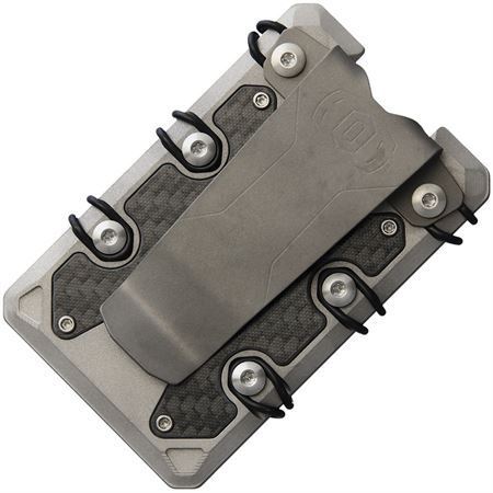 Model - EOS052. Wallet 3.0 Bead Blast. Dimensions: 3.5 inch x 2.25 inch. Bead blast finish. Carbon fiber inlay. RFID blocking. Built-in bottle opener. Held together by 6 O-rings that provide constant tension on cards. Deep carry money clip. Titanium construction. Bulk packed.