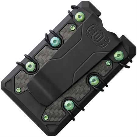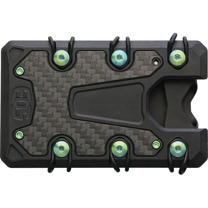 Model - EOS053. Wallet 3.0 Black Green. Dimensions: 3.5 inch x 2.25 inch. Black finish with green anodized accents. Carbon fiber inlay. RFID blocking. Built-in bottle opener. Held together by 6 O-rings that provide constant tension on cards. Deep carry money clip. Titanium construction. Bulk packed.