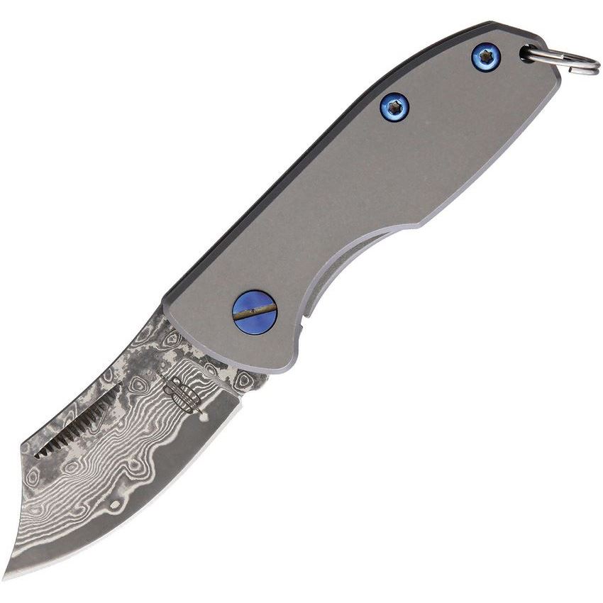 Model/Item/Part - BNB7800M. BucknBear Knives - Mini EDC Framelock Knife. 2.5" (6.35cm) closed. 1.75" (4.45cm) Damascus steel sheepsfoot blade. Gray titanium handle. Keyring. Boxed. Made in Pakistan.