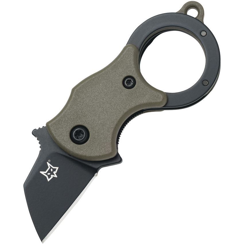 Model/Item/Part - FOX536ODB. Fox Knives - Mini-Ta Linerlock Knife OD. 3.13" (7.95cm) closed. 1" (2.54cm) black finish 4116 stainless blade. OD green FRN handle. Extended tang. Finger ring. Keyring. Pocket clip. Comes with nylon Mini-Ta keychain. Boxed. Made in Italy.