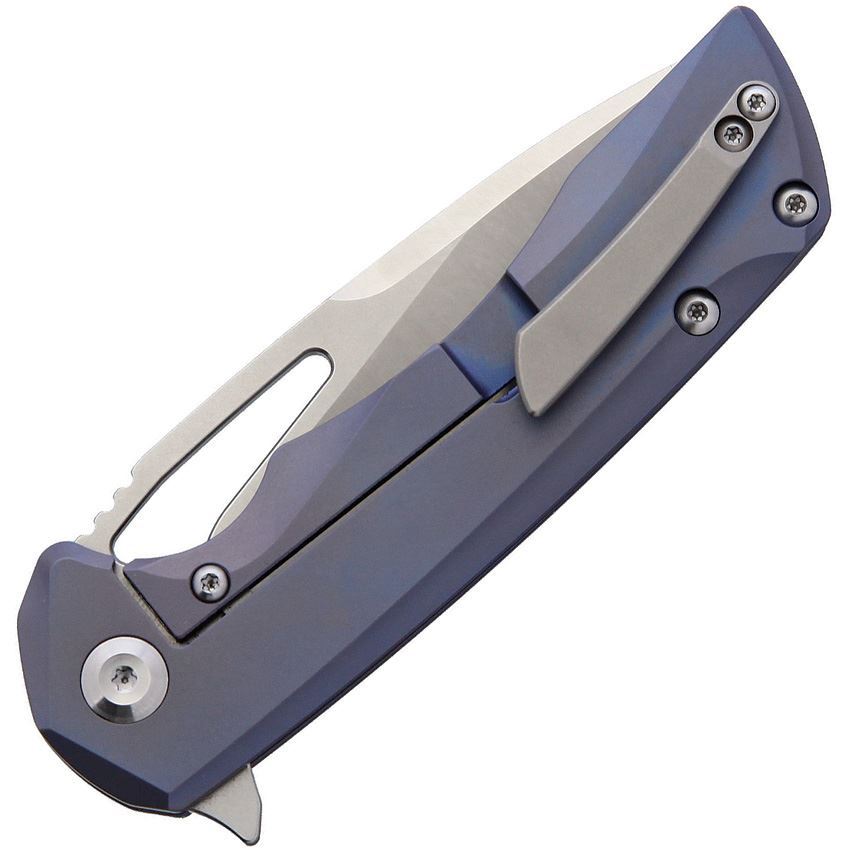 Model/Item/Part - K2001A2. Kansept Knives - Mini Kyro Framelock Knife Blue. 3.75" (9.53cm) closed. 2.75" (6.99cm) stonewash and satin finish CPM S35VN stainless blade. Blue anodized titanium handle. Thumb pull. Extended tang. Pocket clip. Black nylon pouch. Boxed. Made in China.