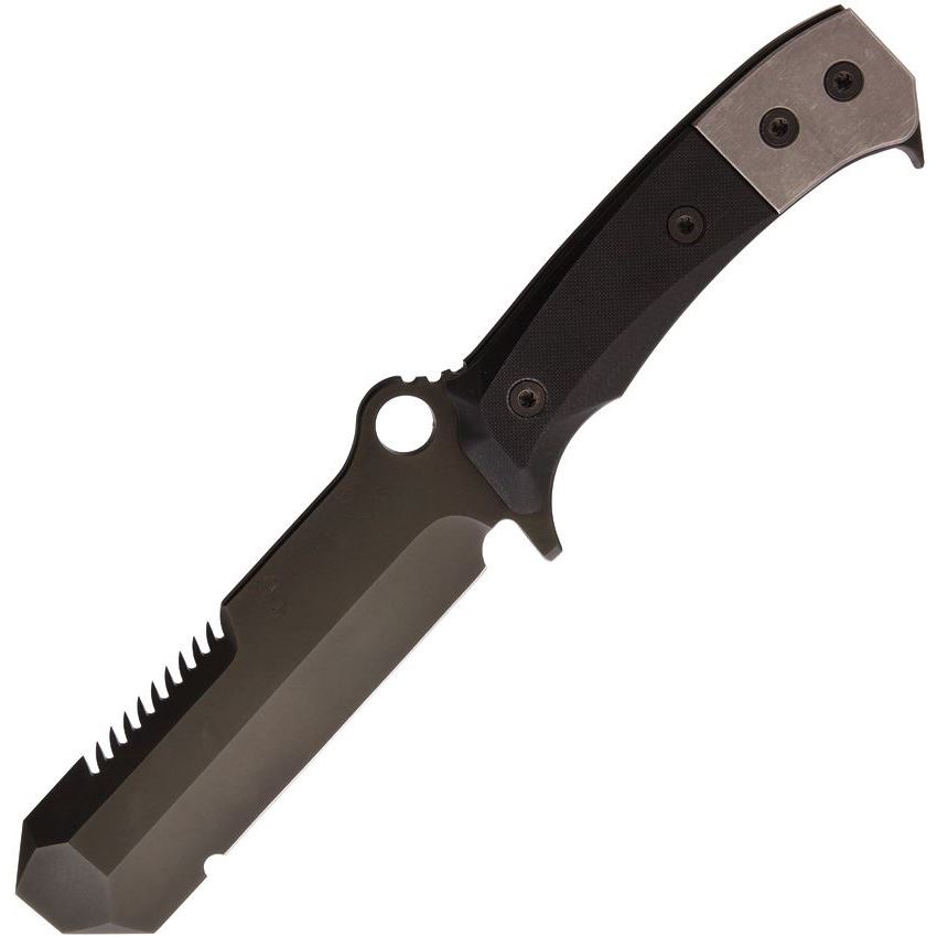 Model - MD0743PQ08KB. USMC EOD-1. 10.25 inch (26.04cm) overall. 5.5 inch (13.97cm) black PVD coated sawback 3V steel blunt tip blade. Full, extended tang. Black G10 and titanium handle. Design was developed in collaboration with current USMC EOD Technicians out of 29 Palms. Side hammer pommel. Carabiner hole for wire pulling. Black nylon zippered storage pouch. Black Kydex belt sheath. Boxed.