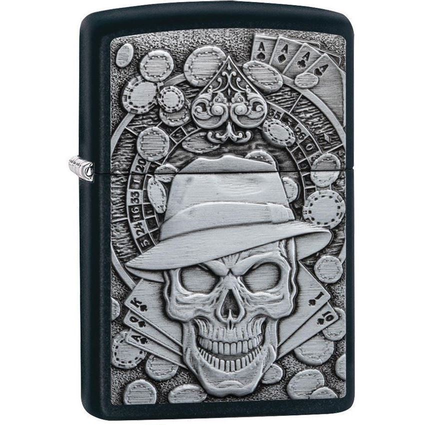 Model - ZO14623. Zippo 14623 - Gambling Skull Lighter. Dimensions: 1.44" x 2.25". Black Matte. Boxed. Proudly made in the USA.