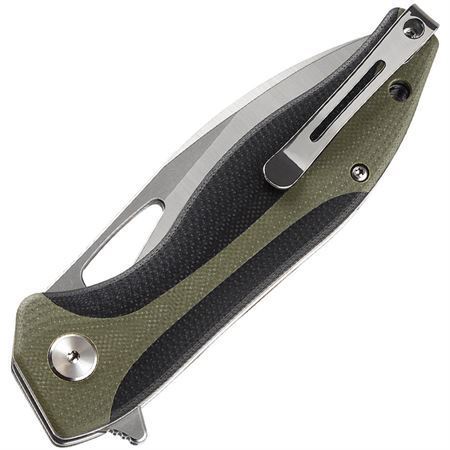 Model/Item/Part - BTKG26A. Bestech Knives - Komodo Linerlock Knife Green. 4.63" (11.76cm) closed. 3.38" (8.59cm) stonewash and satin finish D2 tool steel blade. Black and green G10 handle. Extended tang. Thumb pull. Lanyard hole. Pocket clip. Boxed. Made in China.