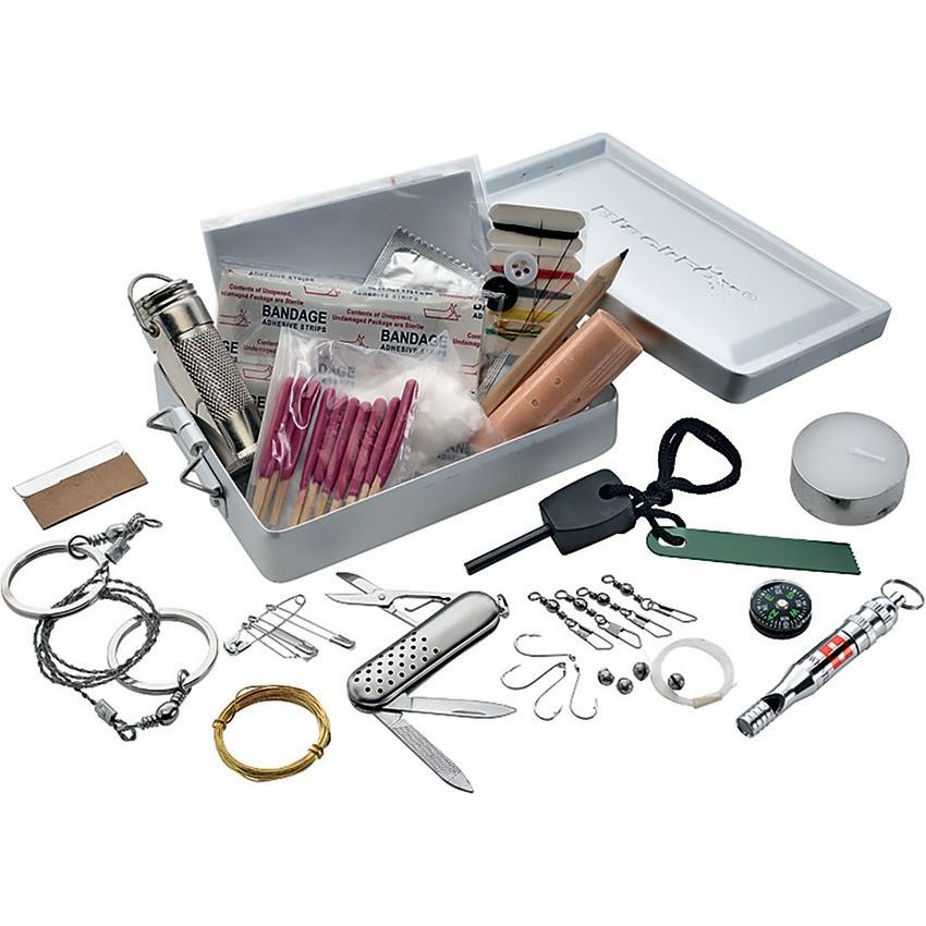 • Includes: Fire starter with striker; Emergency candle; Button compass; Emergency whistle; Fishing hooks, Small Swiss Army style knife; Safety pins; Fishing line; Small wire saw; Razor blades; Bandages; Small sewing kit; Match safe; Cotton balls; Notepad; Small pencil