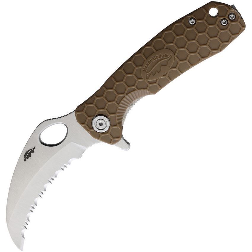Model/Item/Part - HB1132. Honey Badger Knives - Medium Claw Linerlock Knife. 4.13" (10.49cm) closed. 3" (7.62cm) satin finish serrated 8Cr13MoV stainless blade. Tan textured GRN handle. Extended tang. Lanyard hole. Pocket clip. Thumb pull. Boxed. Made in China.