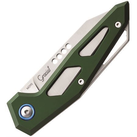Model/Item/Part - MKMEGAGR. MKM Maniago Knife Makers - Edge Slipjoint Green. 4" (10.16cm) closed. 3" (7.62cm) satin finish Bohler M390 stainless blade. Green aluminum handle. Lanyard hole. Brown leather belt sheath. Boxed. Made in Italy.