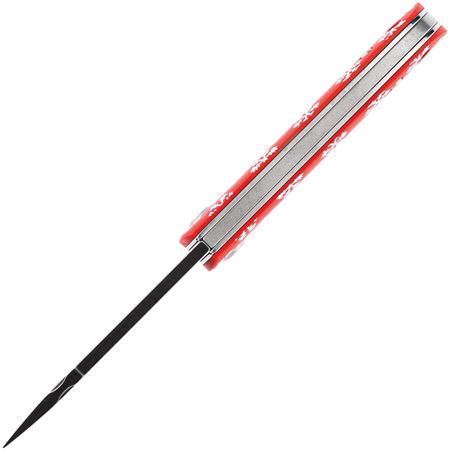 Model - KT2026SC. 3.25 inch (8.26cm) closed. 2.25 inch (5.72cm) black stonewash finish 154CM stainless clip point blade. Red G10 handle. Lanyard hole. White snowflake artwork on handle. Black nylon pouch. Boxed. Made in China