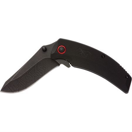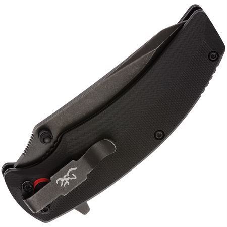 Model/Item/Part - BR0440. Browning Knives - Patriot 1776 Knife. 3.75" (9.53cm) closed. 3" (7.62cm) black stonewash finish stainless blade. Black G10 handle. Extended tang. Thumb stud. Pocket clip. Red aluminum backspacer. Boxed. Made in China.