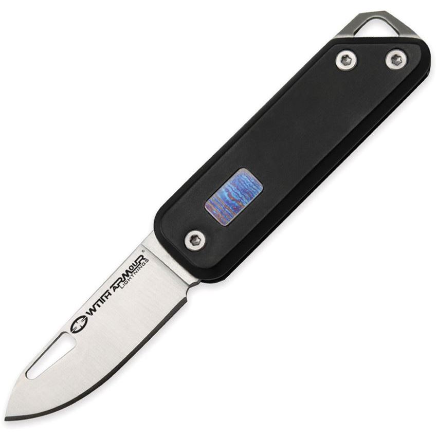 Model/Item/Part - WAR103BK. WithArmour - Egret Folder. 2.38" (6.05cm) closed. 1.5" (3.81cm) satin finish Sandvik 12C27 stainless blade. Black aluminum handle with timascus inlay. Lanyard hole. Boxed. Made in China.