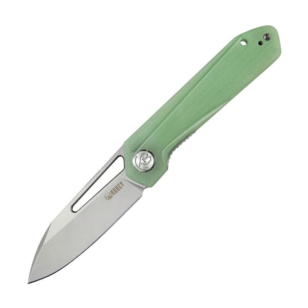 Model/Item/Part - KUB321B. Kubey Knives - Royal Knife Jade. 4.25" (10.8cm) closed. 3" (7.62cm) satin finish D2 tool steel blade. Jade G10 handle. Extended tang. Thumb pull. Lanyard hole. Pocket clip. Boxed. Made in China.