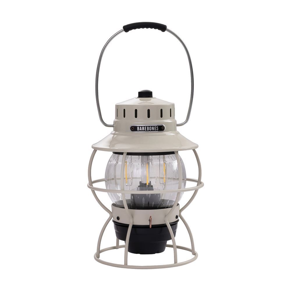Model - BARE180. Barebones Living Railroad Lantern Vintage White. Water and rust resistant finish on steel components. Replaceable, seeded glass globe. 3.2W adjustable warm Edison-style LED filament. Low (35 lumens), High (200 lumens. 5V USB input. USB-C cable included. Color: White. Requires (2) 18650 batteries (included). Boxed with hanging tab. Made in China.