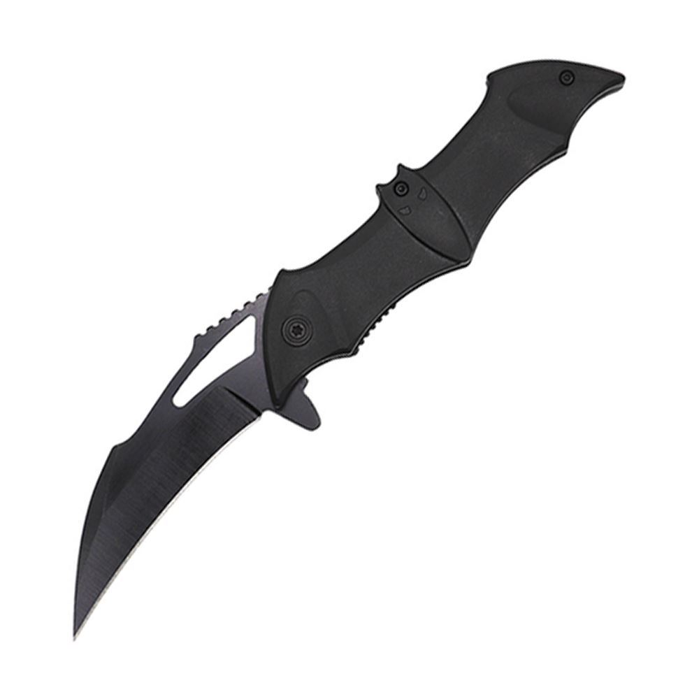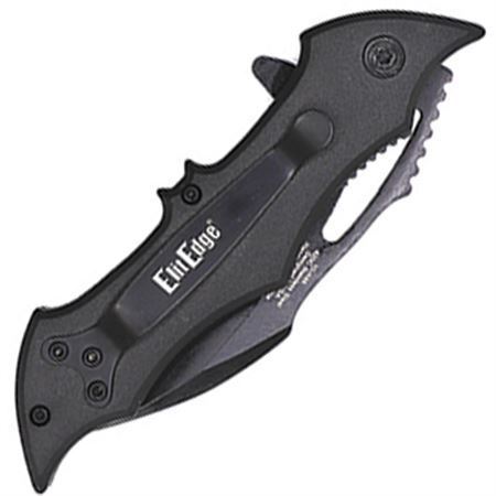 Model/Item/Part - EE10A86BK. ElitEdge - Black Bat Assist Open Linerlock Knife with Handles. Assisted opening. 5" (12.7cm) closed. 3.75" (9.53cm) black finish stainless blade. Black synthetic handle. Extended tang. Thumb pull. Pocket clip. Bat shaped handle. Boxed. Made in China.