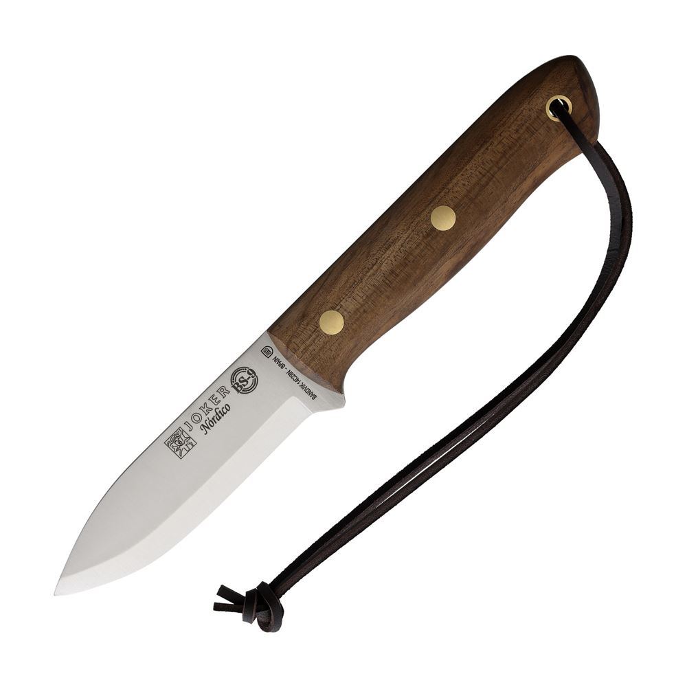 Model - JKRCN115. Joker Nordico Fixed Blade Walnut. 8.75" (22.23cm) overall. 4" (10.16cm) satin finish 14C28N Sandvik stainless blade. Walnut handle. Full tang. Lanyard hole. Brown leather belt sheath. Boxed. Made in Spain.