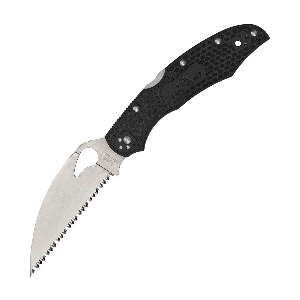 Model - BY03SBKWC2. Byrd Cara Cara 2 Lockback. 4.88" (12.4cm) closed. 3.75" (9.53cm) satin finish serrated 8Cr13MoV stainless Wharncliffe blade. Black FRN handle. Thumb pull. Lanyard hole. Pocket clip. Boxed. Made in China.
