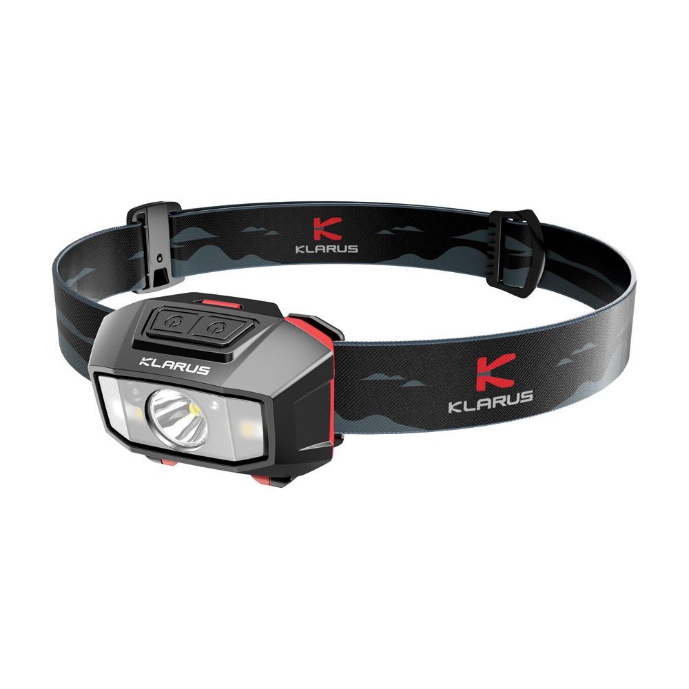 Model - KLRHM2. Klarus HM2 Headlamp. Strobe. Water resistant. Impact resistant. CREE XP-G3 LED. Modes: Main Lamp-High (270 lumens, 5.5h runtime); Low (100 lumens, 16h runtime); Side Lamp white-High (60 lumens, 17h runtime); Low (30 lumens, 21h runtime); Side Lamp Red-High (3 lumens, 26h runtime). 81m beam distance. Elastic, breathable head strap. Multi-function hook. Integrated emergency whistle in headband buckle. Requires (3) AAA batteries (not included). Polymer construction. Color: Black. Boxed. Made in China.