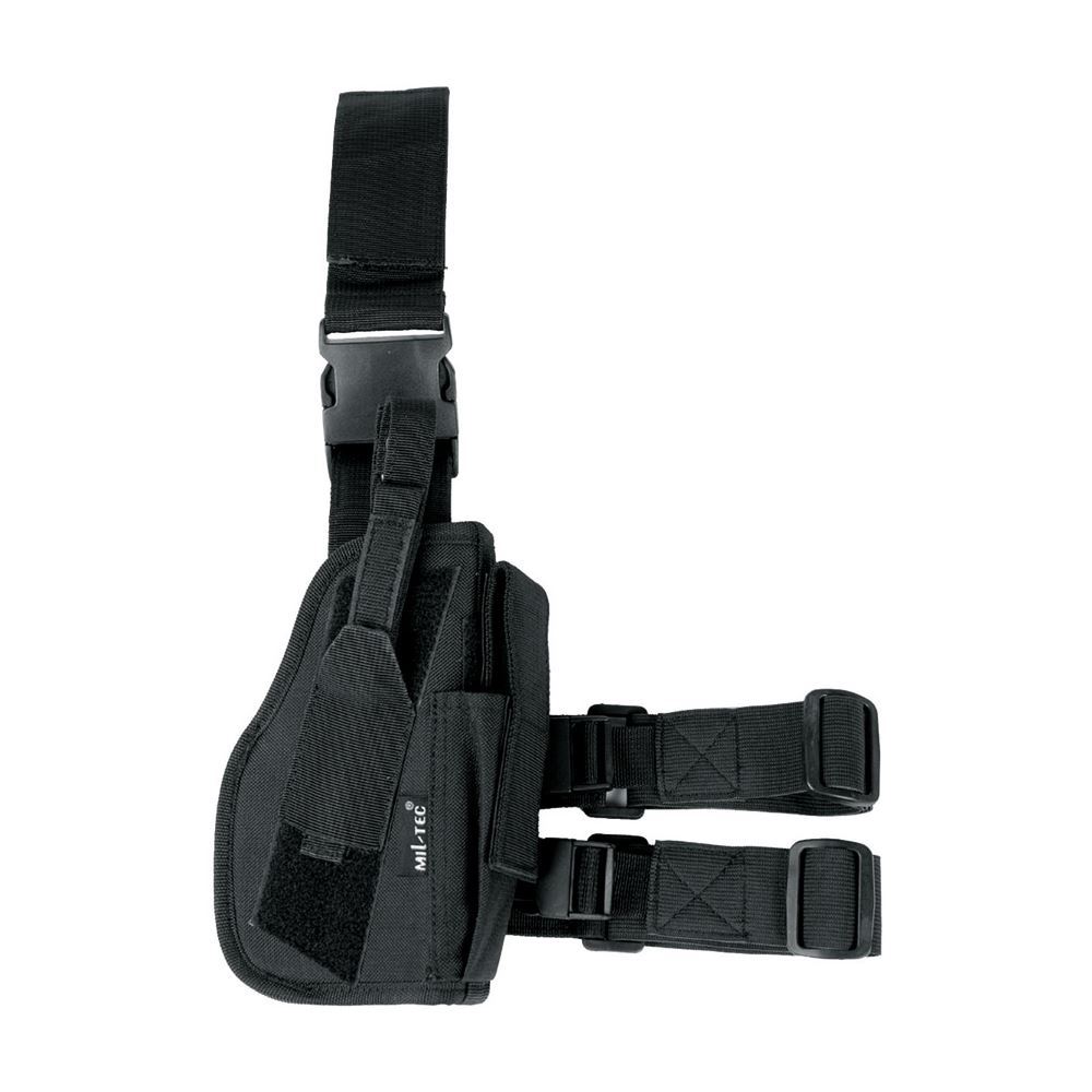 Model/Item/Part - M4475. Mil-Tac Gear - Low Ride Holster Black. Polyvinyl chloride coated. Elastic and adjustable leg loop. Extension for fixation on service belt. Compatible with GLock 17, Beretta 92, a911 models, and more. Touch-fastener side pouch will hold a 7-15 round pistol mag. Polyester construction. Color: Black. Bulk packed. Made in China.