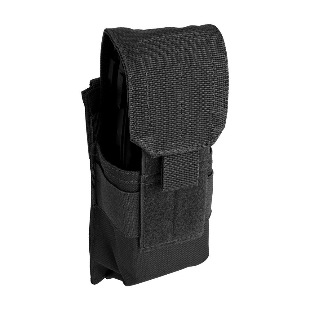 Model/Item/Part - RED82020BLK. Red Rock Outdoor Gear - Single Rifle Mag Pouch Black. Product Dimensions: 3.5" x 8". Holds two rifle magazines. Fits most 20-30 round magazines. Quick access touch fastener cover flap with adjustable height. Reinforced MOLLE attachment points. 600D polyester construction. Color: Black. Hang packaged. Made in China.