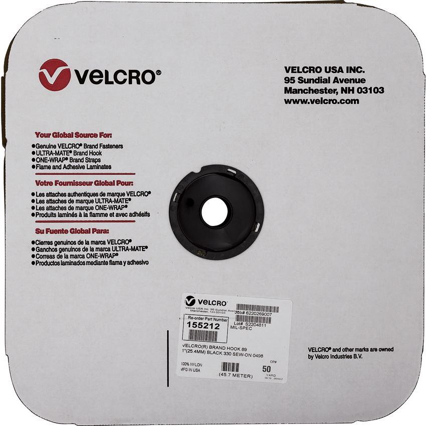 Model - VLC155212. Velcro Mil-Spec Hook Sew-On. Width: 1 in Length: 50 yd. Color: Black Proudly made here in the USA.