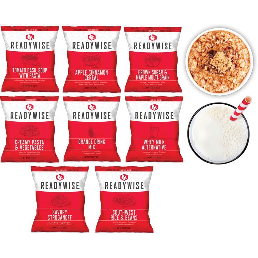 • Includes: Creamy pasta and vegetable rotini (4 servings); Savory stroganoff (4 servings); Tomato basil soup with pasta (4 servings); Southwest beans and rice (4 servings); Brown sugar and maple multi-grain (4 servings); Apple cinnamon cereal (4 servings); Orange delight drink mix (16 servings); Whey milk alternative (12 servings)