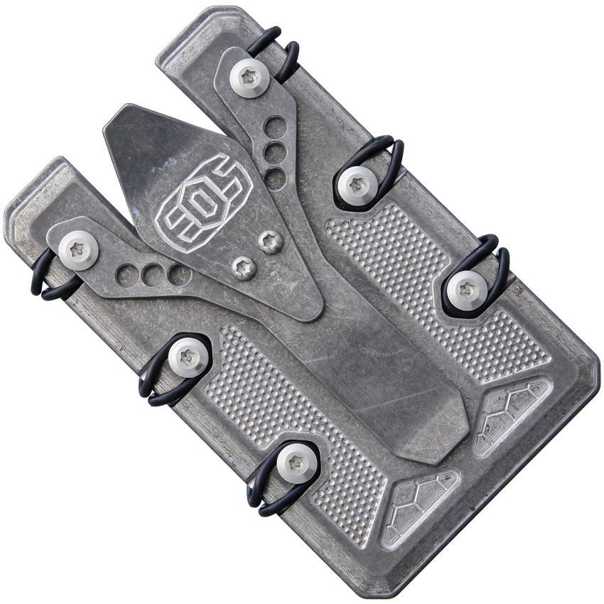 Model - EOSWAL25SW. EOS Titanium 2.5 Wallet Stonewash. Dimensions: 3.63" x 2.25". Stonewash finish. Accommodates 25 cards or 20 cards and 20 bills, or up to 60 bills alone. The contents are accessed by using the thumb slot, which doubles as a bottle opener, to slide the contents partially out of the wallet. Includes two spare O-rings. Titanium construction. Bulk packed. Proudly made here in the USA..