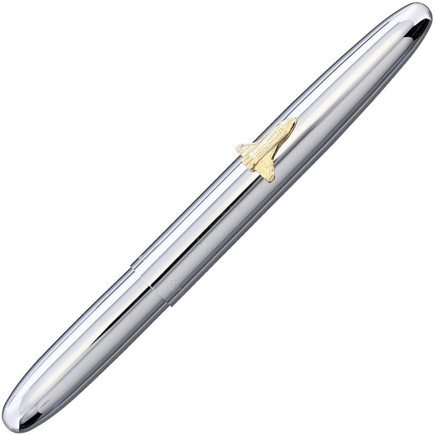 Model - FP841244. Fisher Space Pen Chrome Bullet Space Pen. 3.75" closed. PR4 black ink, medium point cartridge. Writes upside down, at any angle, under water, over grease, and in extreme temperatures. Color: Chrome. Space shuttle on pocket clip. Boxed. Proudly made here in the USA..