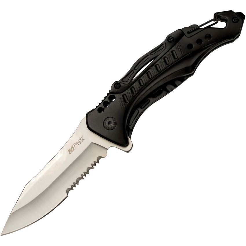 Model/Item/Part - MTA705G2HS. MTech Knives - Assist Open Linerlock Knife. Assisted opening. 4.75" (12.07cm) closed. 3.5" (8.89cm) satin finish partially serrated stainless blade. Black aluminum handle. Attachment clip. Extended tang. Pocket clip. Thumb pull. Boxed. Made in China.