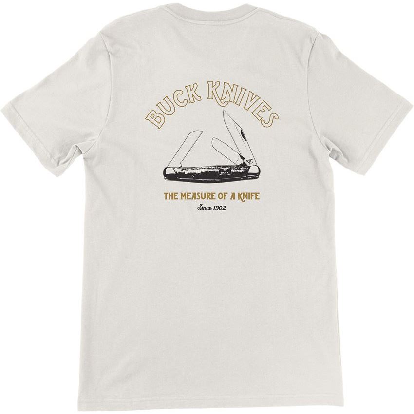 Model - BU13385. Buck Measure of a Knife T-Shirt XL. Small Buck logo on front chest. The Measure of a Knife artwork on back. Midweight. Regular fit. Cotton construction. Color: Natural. Size: X-Large. Bulk packed. Made in China.