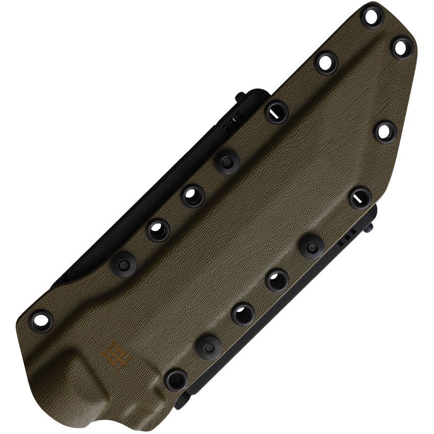 Model/Item/Part - HBBMIK05PSOD. Halfbreed Blades - Medium Infantry Knife OD. 11.75" (29.85cm) overall. 6.75" (17.15cm) OD green Teflon coated partially serrated Bohler K110 stainless tanto blade. OD green sculpted G10 handle. Full, extended tang. Lanyard hole. Black Kydex MOLLE compatible belt sheath. Boxed. Made in Australia.
