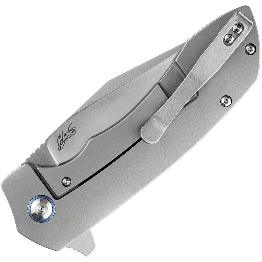 Model/Item/Part - K1036B1. Kansept Knives - Entity Framelock BB. 4.5" (11.43cm) closed. 3.5" (8.89cm) satin finish CPM S35VN stainless blade. Bead blast finish titanium handle. Extended tang. Pocket clip. Black nylon pouch. Boxed. Made in China.