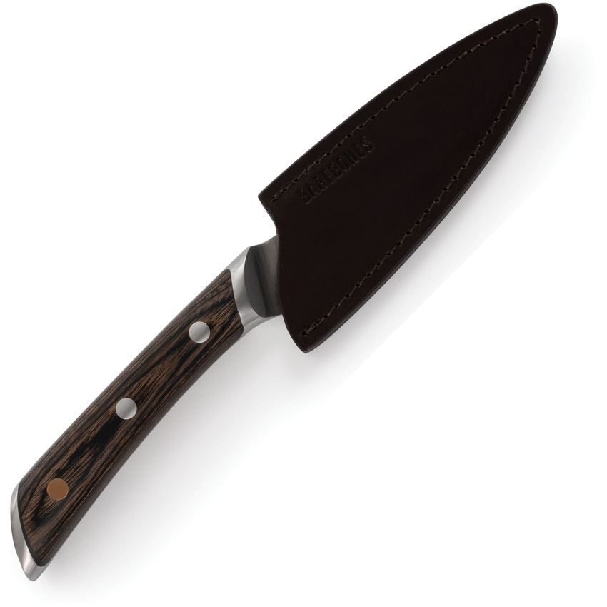 Model/Part Number - BARE491. Barebones Living No. 4 Paring Knife. 8.25" (20.96cm) overall. 3.75" (9.53cm) satin finish 5Cr15MoV stainless blade. Brown pakkawood handle. Full tang. Brown leather sheath. Boxed. Made in China.