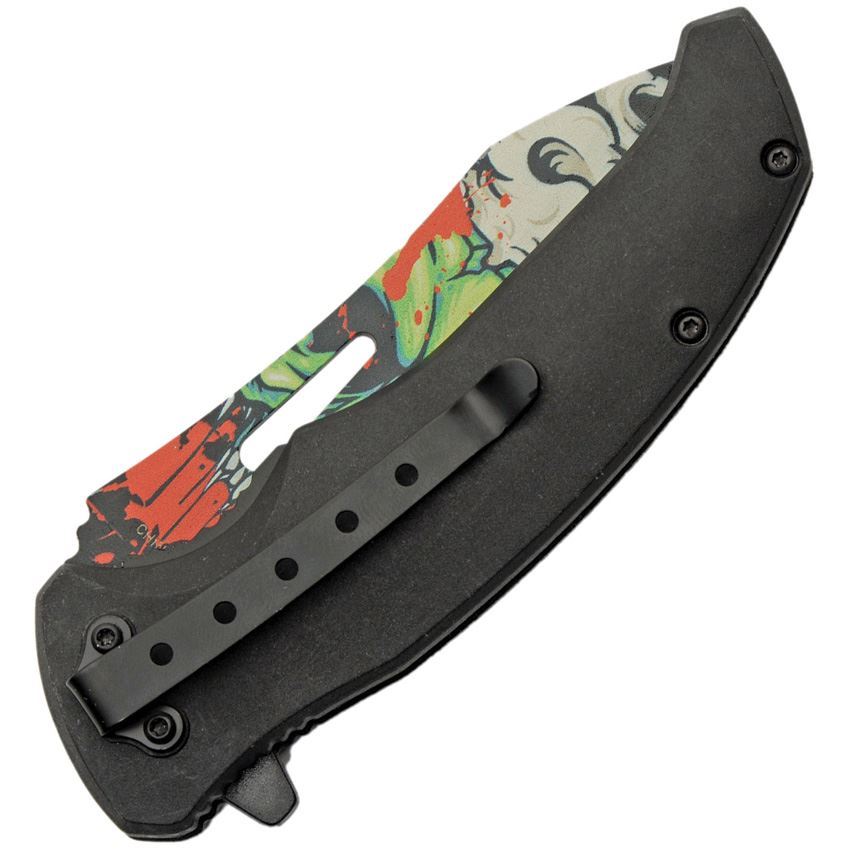 Model/Item/Part - CN300577GN. China Made - Radium Skull Linerlock A/O. Assisted opening. 4.75" (12.07cm) closed. 3.75" (9.53cm) stainless blade. ABS handle. Thumb pull. Extended tang. Pocket clip. Black, green, and red 3-D printed skull blade and handle artwork. Boxed. Made in China.