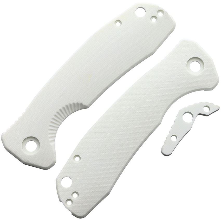 Model/Item/Part - HB4021. Honey Badger Knives - Large Linerlock Handle White. 4.63" overall. Fits Honey Badger large linerlock. Comes with backspacer. G10 construction. Color: White. Bulk packed. Made in China.