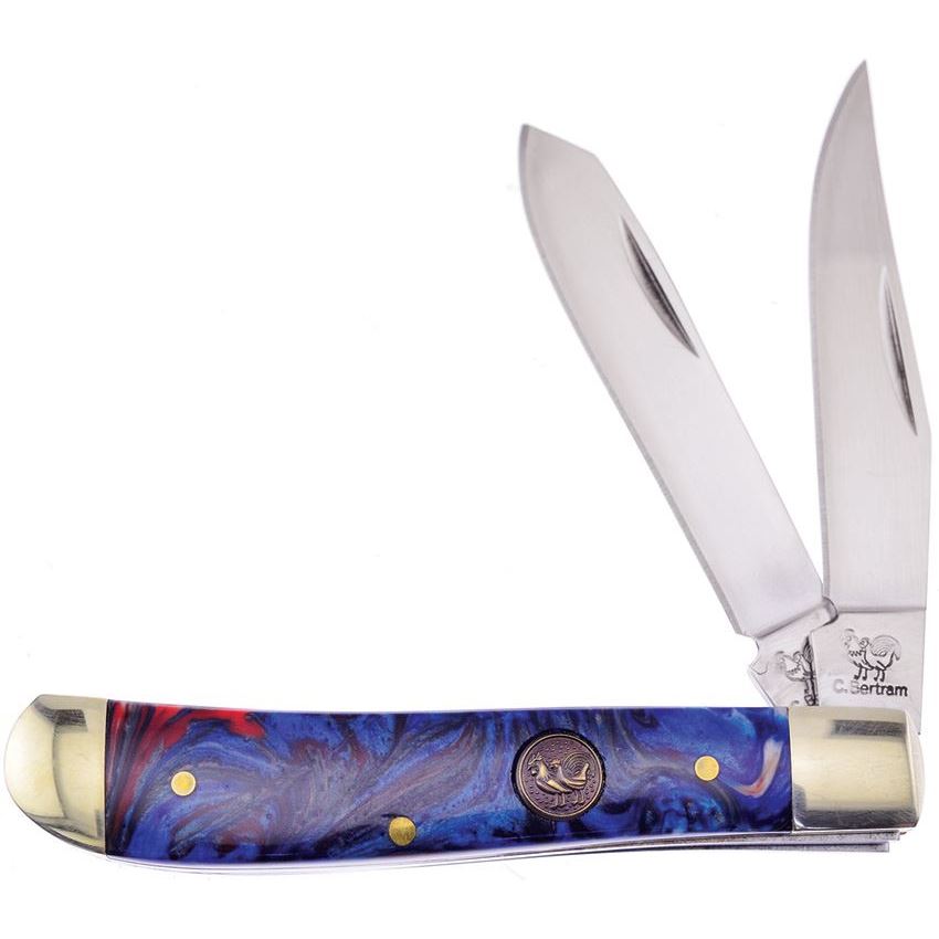 Model/Part Number - HR212STAR. Hen & Rooster Knives Small Trapper Resin. 3.5" (8.89cm) closed. Mirror finish stainless clip and spey blades. Red, white, and blue resin handle. Nickel silver bolster(s). Inlay shield. Boxed. Made in China.