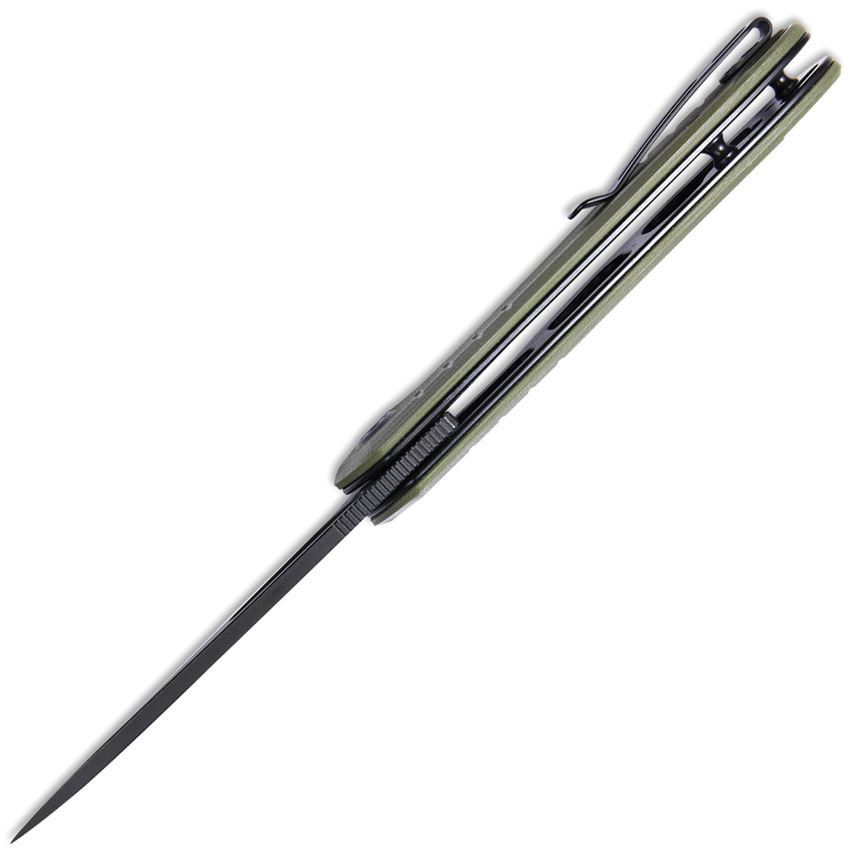 Model/Item/Part - KUB324C. Kubey Knives - Doris Linerlock Black OD. 4.5" (11.43cm) closed. 3.25" (8.26cm) black stonewash finish D2 tool steel blade. OD green G10 handle. Extended tang. Lanyard hole. Pocket clip. Thumb pull. Boxed. Made in China.