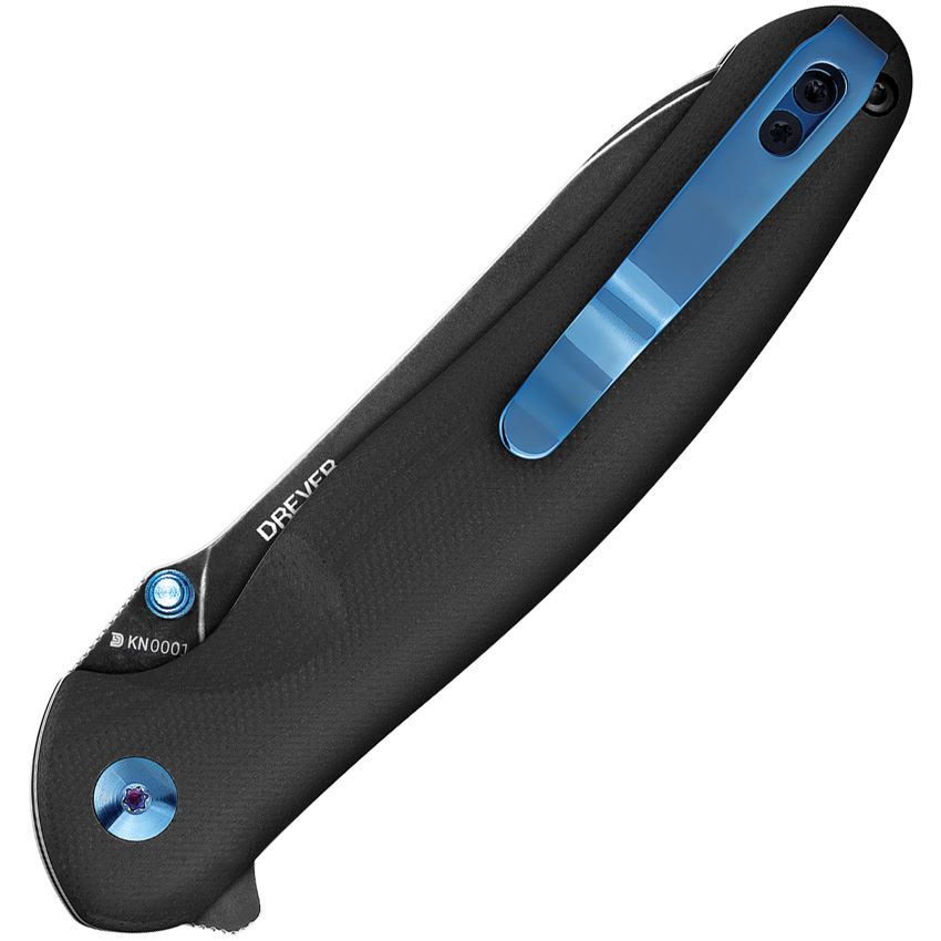 Model/Item/Part - OLTDREVERBK. Olight - Drever Linerlock Knife with Black Handles. 4.5" (11.43cm) closed. 3.5" (8.89cm) black finish Bohler N690 stainless blade. Black G10 handle. Thumb stud. Extended tang. Pocket clip. Modified sheepsfoot blade. Boxed. Made in China.